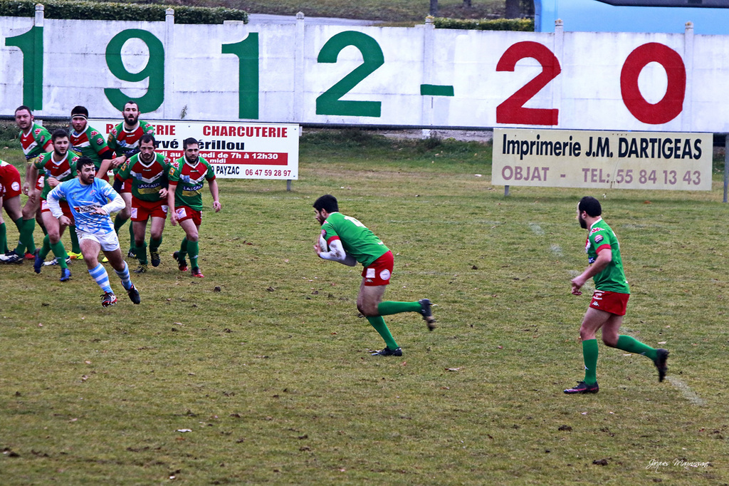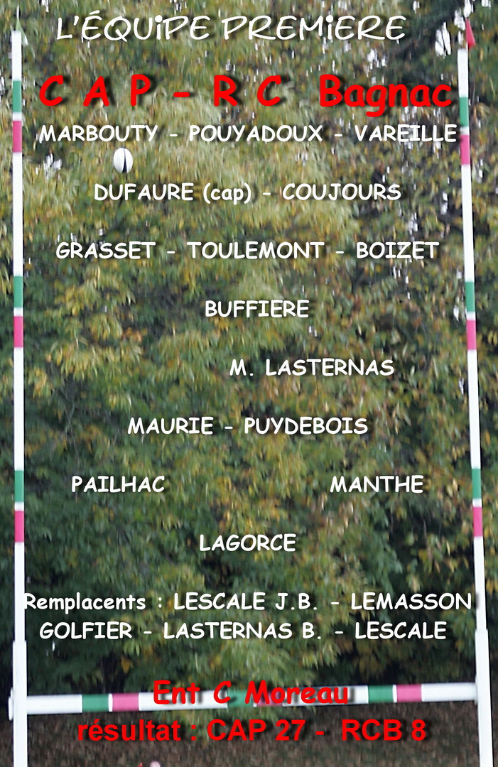 Compo de l'équipe / Marbouty Pouyadoux Vareille – Dufaure(cap) Coujours – Grasset Toulemont Boizet – Buffiere – M. Lasternas – Pailhac Maurie Puidebois Manthe –