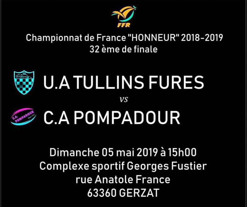 Ce sera donc le club de Tullins-Fures ( entre Voiron et Grenoble) qui sera opposé à Pompadour pour le 32eme de finale du championnat de France Honneur. Stade de Gerzat pres de Clermont Ferrand